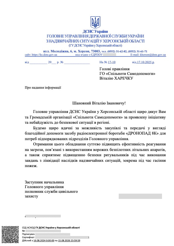 Кожен внесок наближає той момент, коли рятувальники Херсонщини отримають надійний захист від повітряних атак.